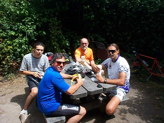 Umm good! Lunch at Butano State park. From the left are Matthew Griffin, Rick Oswald, Rick Burrows and Steve Hoppe.